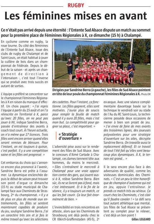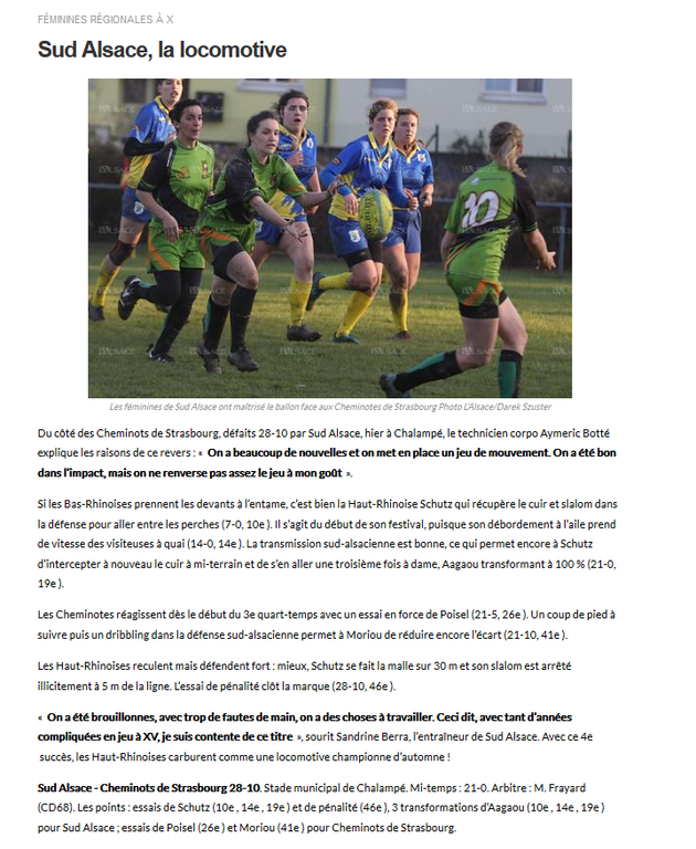 Bel article trouvé dans l'Alsace lundi 20 novembre, suite à la victoire des féminines Sud Alsace face aux Cheminotes de Strasbourg.